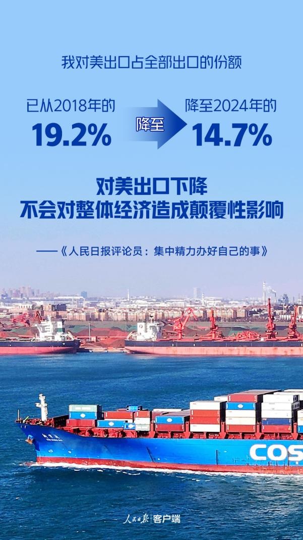 但要看到,中國是超大規模經(jīng)濟體,面對美國的關(guān)稅霸凌沖擊,我們具有強大的抗壓能力。近年來(lái)我們積極構建多元化市場(chǎng),對美市場(chǎng)依賴(lài)已在下降。我對美出口占全部出口的份額已從2018年的19.2%降至2024年的14.7%,對美出口下降不會(huì )對整體經(jīng)濟造成顛覆性影響。美國內不少產(chǎn)品對我依存度較高。當前美國不僅在很多消費品上離不開(kāi)中國,很多投資品和中間產(chǎn)品也需要從中國進(jìn)口,有若干品類(lèi)依存度超過(guò)50%,短期內在國際市場(chǎng)上很難找到替代來(lái)源。在全球產(chǎn)供鏈深度交融的大背景下,中美貿易不可能完全中斷。新興市場(chǎng)經(jīng)貿合作潛力巨大,日益成為我穩外貿的重要基礎。我國是全球150多個(gè)國家和地區的主要貿易伙伴,2018年以來(lái),我對東盟出口占比由12.8%提升到16.4%,對共建“一帶一路”國家出口占比由38.7%提升到47.8%,且保持較快增長(cháng)勢頭。國內市場(chǎng)緩沖空間廣闊,是重要的大后方。據統計,2024年我有出口實(shí)績(jì)的數十萬(wàn)家企業(yè)中,接近85%的企業(yè)同時(shí)開(kāi)展內銷(xiāo)業(yè)務(wù),內銷(xiāo)金額占銷(xiāo)售總額的近75%。國家正加快打通“出口轉內銷(xiāo)”政策堵點(diǎn)、卡點(diǎn),擴內需各項政策也在加力擴圍,內需市場(chǎng)的容納效應將日益顯現。